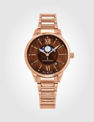 Ladies Quartz Moonphase Date Watch with Rose Gold Tone Stainless Steel Case on Rose Gold Tone Stainless Steel Bracelet, Brown DIAMOND Dial