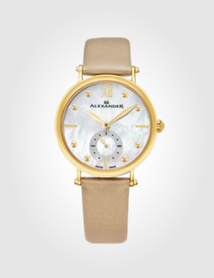 Our Roxana A201 is the epitome of cool. Somewhat reminiscent of your most fashionable grandmother, its satin strap and mother of pearl dial is classic, in the best way. The gold satin strap model matches well with Chloe’s mix of crazy prints and neutral, body con staples. The Roxana is fresh and timeless, just like Chloe.