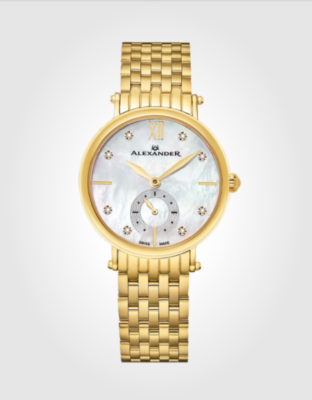 Roxana AD201B // Ladies Quartz Small-second Watch with Yellow Gold Tone Stainless Steel Case on Yellow Gold Tone Stainless Steel Bracelet, White Mother-of-Pearl DIAMOND Dial