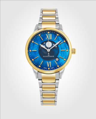 Vassilis A204B // Ladies Quartz Moonphase Date Watch with Yellow Gold Tone Stainless Steel Case on Yellow Gold Tone Stainless Steel and Stainless Steel Bracelet, Blue Dial